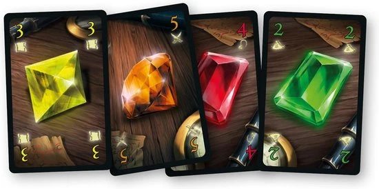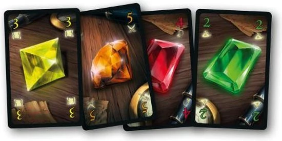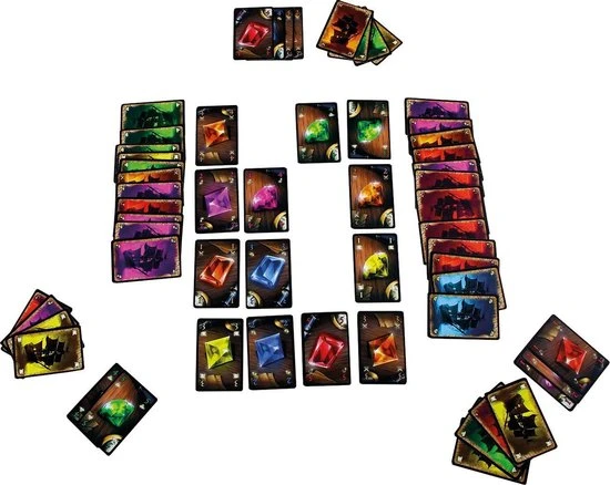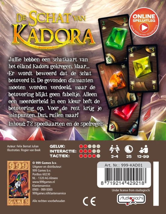 Na maanden over de wereldzee?n te hebben gevaren ben je met je piratenvrienden eindelijk op het eiland Kadora aangekomen. Het is jullie gelukt om in een grot de enorme schat aan gekleurde diamanten te vinden, precies zoals de schatkaart voorspelde. Jullie hebben de diamanten gelijk over de zeerovers verdeeld, echter terug op het schip blijken de diamanten betoverd te zijn. Het schip kan simpelweg niet uitvaren. Het lukt jullie niet om van het eiland weg te komen. Hoe meer diamanten je in je bezit hebt, hoe zwaarder de betovering is. Het gaat je alleen lukken om weg te komen als je van ten minste ??n kleur diamant de meerderheid in handen weet te krijgen, wat niet makkelijk zal zijn want niemand wil zonder strijd zijn buit afstaan. Elke beurt kunnen de spelers kaarten trekken, weggeven of op tafel leggen met als doel om van ten minste ??n kleur de meeste diamanten te bezitten. Alle andere diamanten leveren strafpunten op, dus de speler met de minste strafpunten wint het spel. Wie kan er straks uitvaren? En wie moeten er voor altijd op het eiland achterblijven met de rest van de schat?