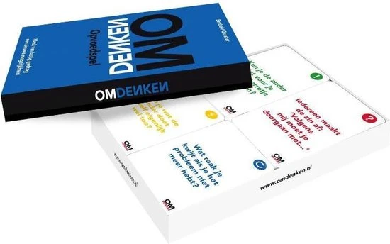 Dit spel bevat een fraai vormgegeven boekje met een to-the-point handleiding hoe het kaartspel te spelen en een aangenaam ontregelende stoomcursus omdenken. Verder bevat het 144 smaakvolle omdenkkaarten, verdeeld over vier groepen (rood, geel, groen en blauw) van elk 36 kaarten. De groepen corresponderen met de vier vragen van het omdenken, waarmee in vier rondes (opvoed-) problemen kunnen worden omgedacht.
