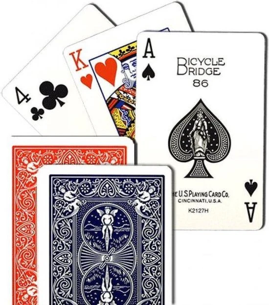 Op zoek naar een standaard setje speelkaarten? De Bicycle Bridge kaarten zijn klassieke speelkaarten met een rode of blauwe achterkant. Deze kaarten zijn iets smaller dan gewone kaarten waardoor ze beter in de hand liggen en je gemakkelijk overzicht kunt bewaren. Ook zijn de speelkaarten voorzien van een speciale coating waardoor ze minder snel gaan plakken. De Bicycle Bridge kaarten zijn perfect voor een potje bridge, maar ook voor andere kaartspellen zoals pesten en klaverjassen.
