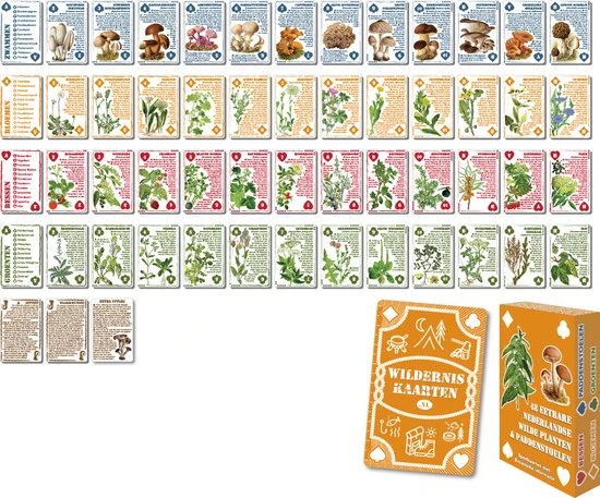 Het pakje bevat normale speelkaarten met informatie over 48 eetbare planten en paddenstoelen uit Noord Europa, aangevuld met een inhoudsopgave op de Azen ?n de uitleg over de universele eetbaarheidstest om te beoordelen of een (niet op de kaarten voorkomende) plant eetbaar is of niet. De kaarten bevatten elk de botanische informatie en mooie afbeeldingen van de planten en paddenstoelen.