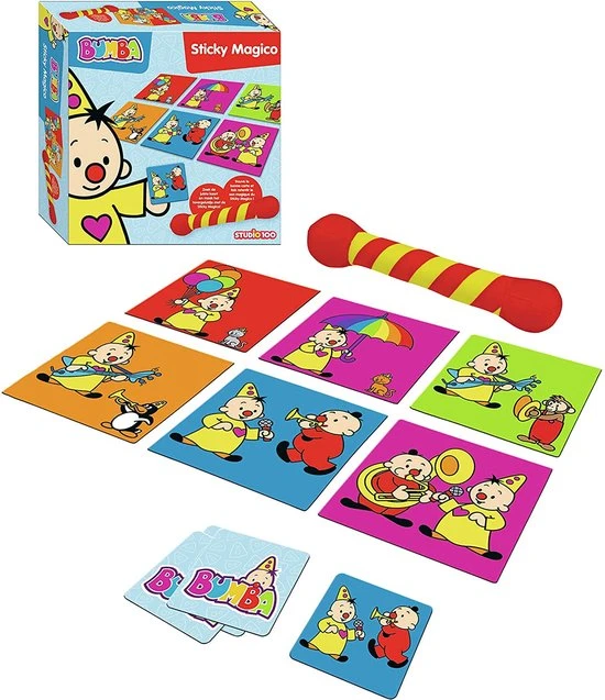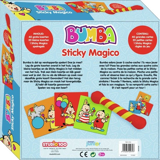 Bumba is dol op verstoppertje spelen! Doe je mee? Leg de grote kaarten overal in het huis. Leg de kleine kaartjes en de Sticky Magico in het midden van het huis. Trek een klein kaartje en kijk goed naar wat je ziet. Ga nu als de bliksem op zoek naar dezelfde grote kaart! Gevonden? Hol dan terug naar de Sticky Magico en maak het tovergeluidje. Jij hebt dit kaartje gewonnen! Spelen we nog een keer?