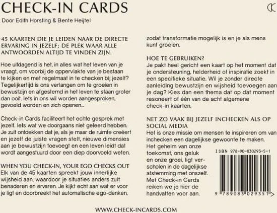 Het geheim van onze toekomst, ons geluk en onze groei ligt verscholen in de dagelijkse afstemming met onszelf. Check-in Cards biedt hier de handvatten voor. Check-in bij jezelf, op ieder willekeurig moment, a.d.h.v ??n van de 45 thema?s die het meest je aandacht trekt.