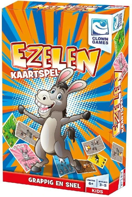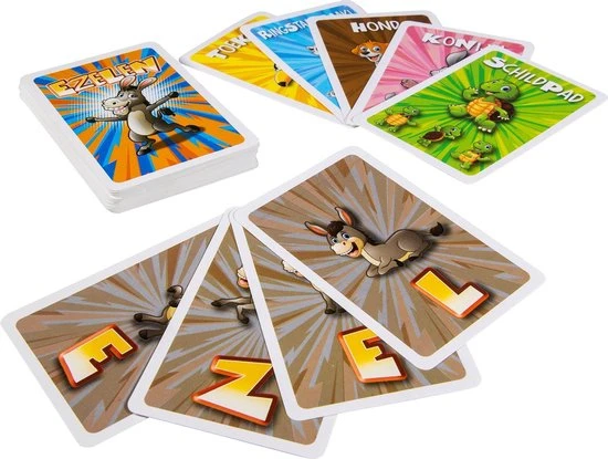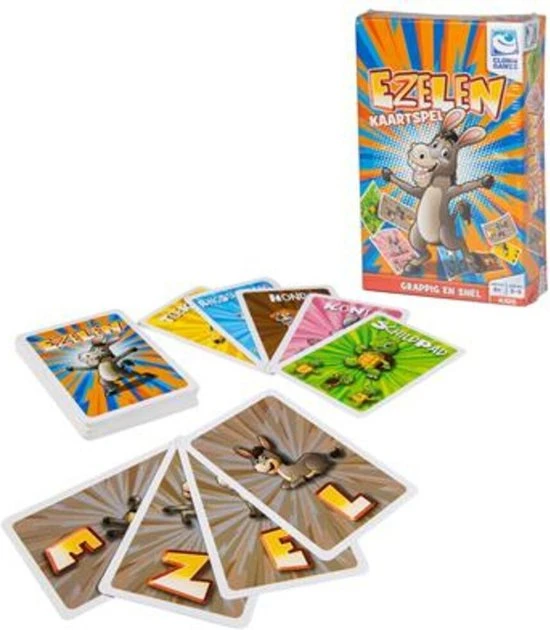 | Verpakkingsinhoud | 20, dierenkaarten, (5, sets, van, 4, afbeeldingen), 20, EZELkaarten, (5, x, elke, letter), 4, ezelpionnen, en, spelregels |