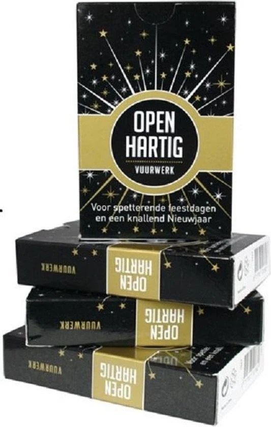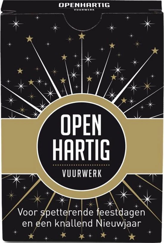 Kleine set Openhartig Vuurwerk vragen, met 52 kaarten. Deze vragen en opdrachten bieden jullie de gelegenheid wensen, ideeën en voornemens met elkaar te delen en zo te zorgen voor fonkelende, spetterende of knallende momenten.