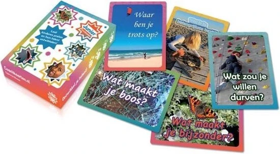 De set Junior Coachkaarten bestaat uit 38 leuke foto’s met prikkelende vragen. De foto’s helpen beeldassociatie op gang te brengen en de vragen zorgen voor net een andere invalshoek bij de start van een gesprek. Deze combinatie blijkt bij kinderen erg goed te werken. Junior Coachkaarten ziet een goed gesprek en bewustwording als basis voor talentontwikkeling.