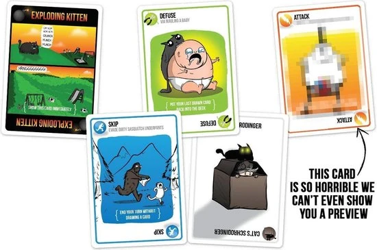 Exploding Kittens is een soort Russisch roulette, maar dan met exploderende kittens. Je neemt kaarten van de stapel totdat je ??n van de gevreesde exploderende kittens trekt. Dan heb je meteen verloren. Met de overige kaarten kun je jezelf verdedigen, aanvallen, een beurt overslaan of katten afleiden. Alle kaarten zijn voorzien van lachwekkende illustraties van The Oatmeal.