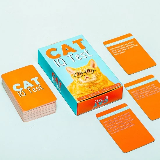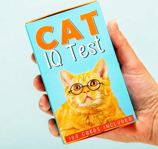 Kat IQ test van Gift Republic. Hoe slim is jouw kat? Dat test je met de vragen en opdrachten van de Kat IQ test. Je krijgt bijvoorbeeld de vraag: weet jouw kat het wanneer je zijn eten voorbereid? In totaal zitten er honderd vragen en opdrachten in de verpakking. Let op: de teksten zijn geschreven in Engels.