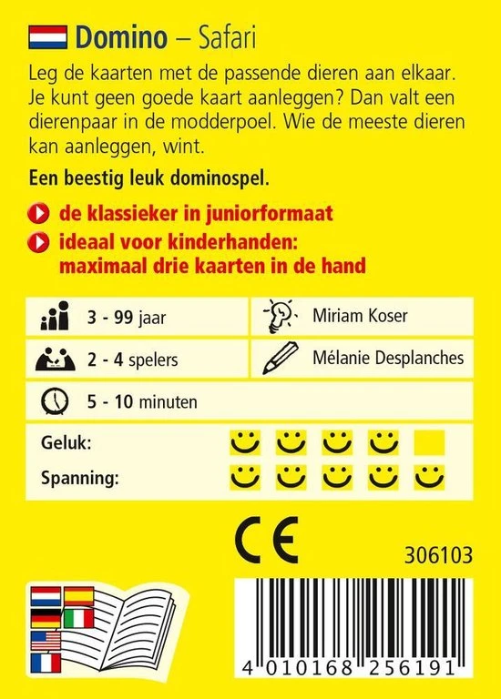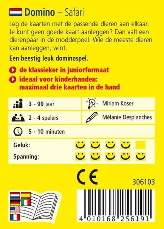 Vandaag is een perfecte dag voor een leuke dierenparade! De spelers leggen de kaarten met passende dieren achter elkaar. Kun je op dit moment geen passende kaart aanleggen? Dan valt een dierenpaar in de modderpoel. Wie aan het einde van deze dominosafari de minste dieren uit de modderpoel moet trekken, wint.