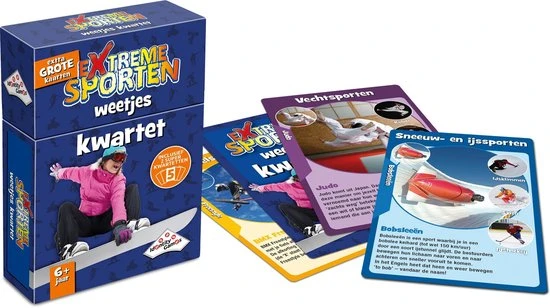 Kwartetten, een oer-Hollands kaartspel waarin steeds 4 kaarten bij elkaar gespaard worden. Kwartet! Nu over extreme sporten, afgebeeld op extra grote kaarten. Op deze kaarten staan naast mooie foto’s, ook nog eens interessante weetjes!