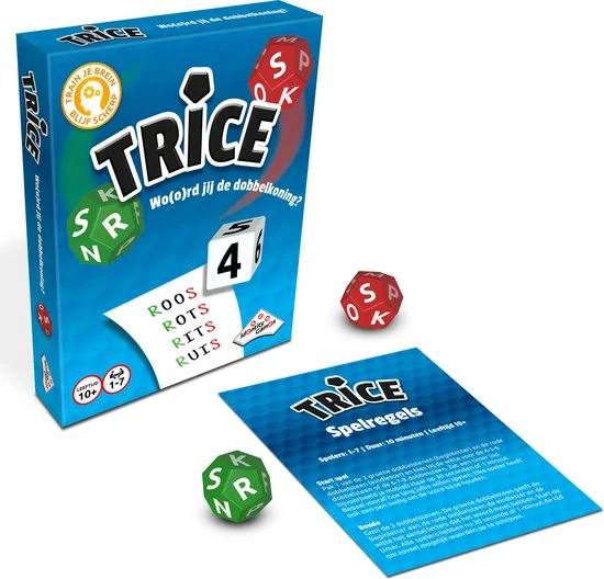 Wo(o)rd jij de dobbelkoning? Met Trice kun je spelen en tegelijkertijd je hersens trainen! Gooi een groene (beginletter), rode (eindletter) en witte dobbelsteen (aantal letters). Schrijf binnen ??n minuut zoveel mogelijk woorden op met de beginletter, eindletter en het aantal letters dat je hebt gegooid. Elk woord is 1 punt. Wie na zes rondes de meeste punten heeft, is de winnaar!