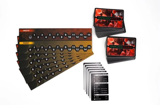 – 108 speelkaarten bestaand uit 10 typen; viruskaarten, bacteriekaarten, medicijnkaarten, vaccinkaarten, immuunsysteemkaarten, uitrustingkaarten, gebruikskaarten, valkaarten, gebeurteniskaarten, en actiekaarten.