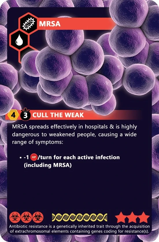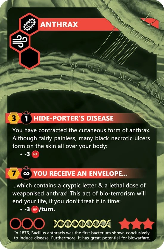 Hou jezelf gezond door zuinig met je HP om te gaan en val aan met infectiekaarten waarbij de hoeveelheid energiepunten (ATP) die je inlegt de ernst van de symptomen bepaalt. Val jij iemand aan die ziek is? Dan kan dit je eigen kop kosten! Er is namelijk een kans dat jij dan ook lijden zal aan de ziekte of het zelfs met de hele tafel deelt!