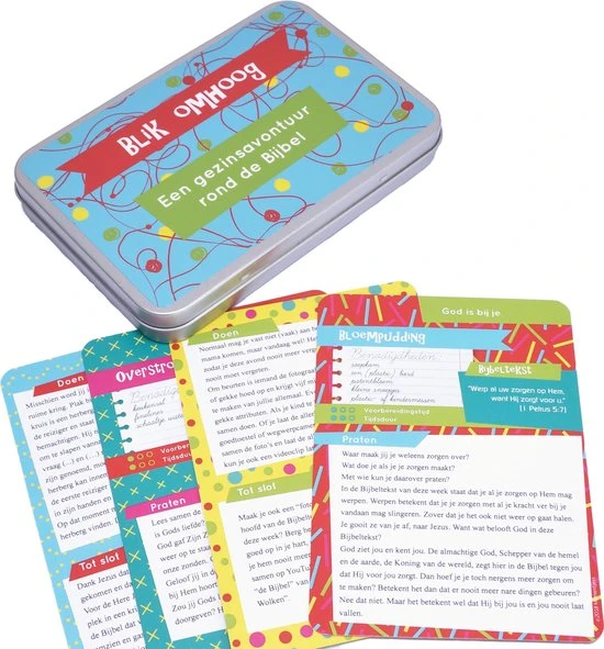 Het blikje bevat 26 spelletjes en activiteiten voor het hele gezin, met de Bijbel als basis. Een mix van lol maken en serieus nadenken. Momenten met diepgang, maar ook gezelligheid. Veelal kort maar krachtig en vooral makkelijk uitvoerbaar. Deze ideeën zijn geschreven voor kinderen van de basisschoolleeftijd, vanaf groep drie tot ca. groep acht. Maar grotere of kleinere kinderen kun je er ook prima op hun eigen niveau bij betrekken.