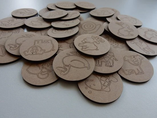 De memorie is van mdf en is per kaartje 3mm dik en is +/- 5 cm doorsnee.