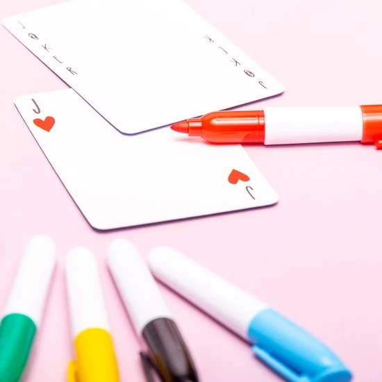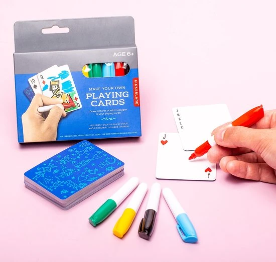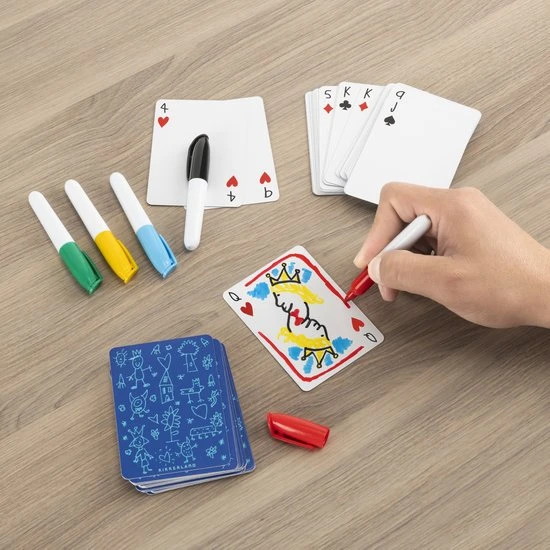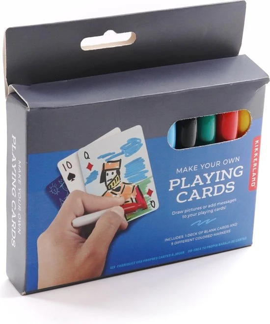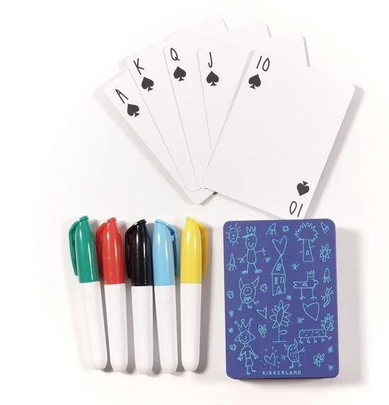 Ontwerp je eigen speelkaarten met de set van Kikkerland. De set bevat kaarten, een blik voor de kaarten en 5 stiften in verschillende kleuren. Maak zelf of samen met je vrienden de leukste tekeningen en berichten voor op de kaarten.