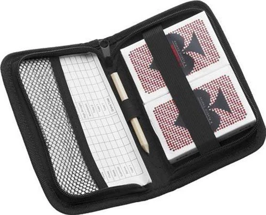 Bevat: Nylon etui met 2 sets geplastificeerde speelkaarten , scoreblok en potlood.