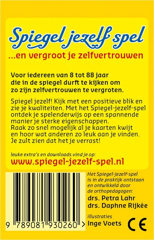 Voor iedereen van 8 tot 88 jaar die in de spiegel durft te kijken om zo zijn zelfvertrouwen te vergroten. Spiegel jezelf! Kijk met een positieve blik en zie je kwaliteiten. Met het Spiegel-jezelf-spel ontdek je spelenderwijs op een leuke spannende manier je sterke eigenschappen. Raak zo snel mogelijk al je kaarten kwijt en hoor wat anderen zo leuk aan je vinden. Je zult zien dat het je verrast!