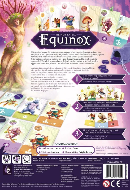 Beleef een betoverend avontuur met het sluwe biedspel Equinox! Aan de rand van een ongerept bos komen allerlei fantastische wezen samen op de equinox te vieren. Tijdens een vriendschappelijke, maar zeer spannende strijd, zetten deze fantastische wezens hun magische krachten in om het tegen elkaar op te nemen. De wezens hebben allemaal hetzelfde doel voor ogen: vereeuwigd worden in de verhalen en fabels die nog jarenlang over hun heldhaftige daden spreken en gedeeld worden.