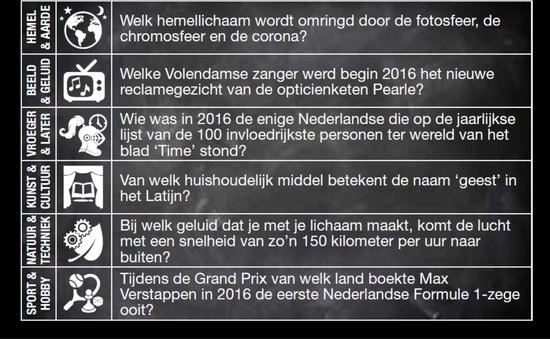 De spelers stellen elkaar om de beurt vragen. Op elke quizkaart staan 6 vragen uit 6 bekende categorie?n. De beantwoorder bepaalt de volgorde waarin de vragen worden gesteld. Vraag 1 levert 1 punt op, de 2e vraag 2 punten, en zo verder t/m de 5e vraag voor 5 punten. De 6e vraag goed betekent zelfs 10 punten! Maximaal dus 25 punten per kaartje. De speler mag na iedere vraag stoppen. Dat kan slim zijn, want bij een fout antwoord gaan alle punten van die beurt verloren… Meeste punten na een afgesproken aantal ronden wint. Veel speelplezier!