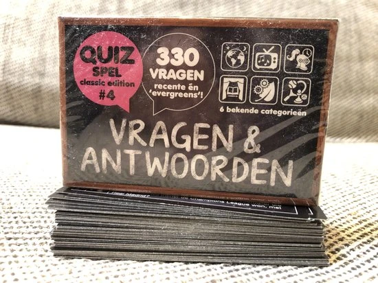 Vragen & Antwoorden – Classic Edition #4 is een pocketformaat (brievenbuspost!) quiz spel (voor 2-6 spelers vanaf 12 jaar) dat zowel als aanvulset / uitbreiding bij andere trivia spellen maar ook als quiz spel op zich gebruikt kan worden. Het spel bevat 55 kaartjes met totaal 330 vragen… z??r recent afgewisseld met ‘evergreens’! De vragen (gemaakt door Marian van Eupen; d? quizvragenmaker van Nederland!) komen uit de 6 bekende categorie?n, gemakkelijk herkenbaar aan de icoontjes. Vragen & Antwoorden… h?t quizspel van dit moment! Niet in de laatste plaats omdat ze makkelijk tijdens videobellen gespeeld kunnen worden! Het past in iedere broekzak en je kunt het spelen waar jij maar wilt (ook via videobellen!). Er bestaan inmiddels alweer 14 edities! Het trivia spel heeft geen ingewikkeld spelmechanisme. Je gaat gewoon lekker elkaars kennis testen.