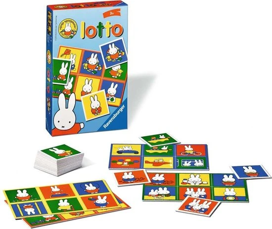 Nijntje nodigt jullie uit om een vrolijk spelletje lotto te spelen met Ravensburger Nijntje Lotto! Op de 24 kaartjes zien jullie Nijntje van alles doen: fietsen, trampoline springen en tekenen. Wie herkent de verschillende afbeeldingen en kan als eerste zijn legbord vol leggen?
