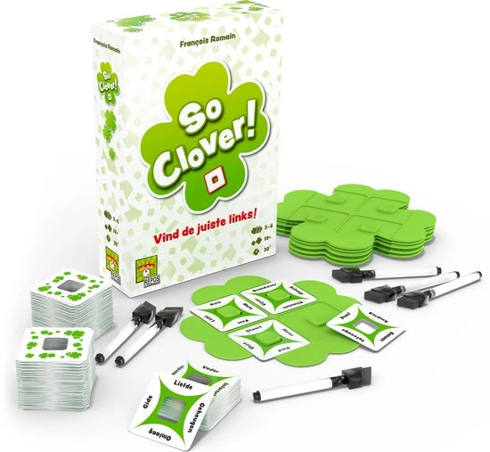 Bij het co?peratieve bordspel So Clover moeten jij en je medespelers zo veel mogelijk trefwoorden raden. Trek kaarten en noteer op jouw eigen klavervormige spelbord de gemeenschappelijke kenmerken tussen de trefwoorden op jouw kaarten – dit zijn je aanwijzingen. Vervolgens moeten jij en je medespelers samenwerken om via een aanwijzingenfase en een besluitface de trefwoorden van elke speler te achterhalen. Aan het einde van het spel scoor je punten voor het aantal trefwoorden dat jullie samen gevonden hebben en noteren jullie je score op de scorelijst.