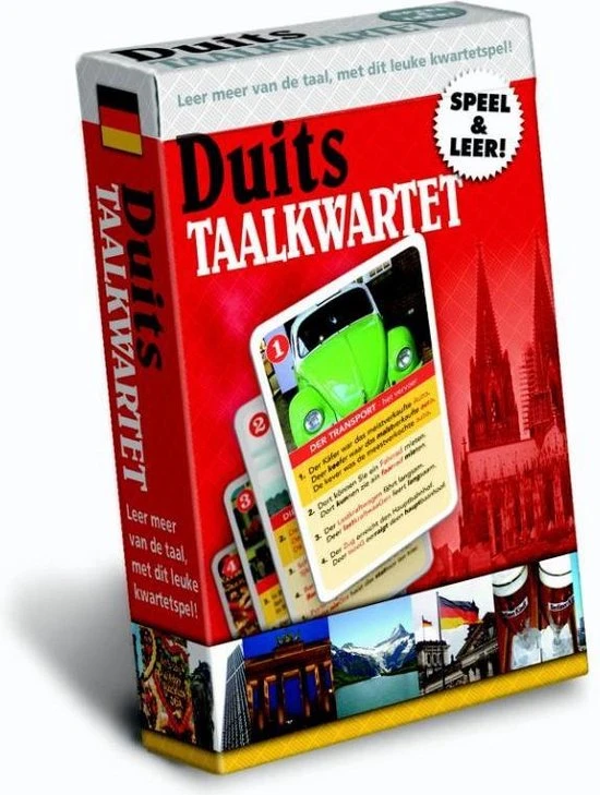 Spelenderwijs woordjes en zinnetjes leren in een vreemde taal met mooie fotokwartetten. 18 kwartetten over allerlei onderwerpen zoals eten, drinken, vakantie, sport, gebouwen, vervoer.Elk woord staat in de context van een hele zin, met uitspraakaanwijzingen. Om de kaart te winnen, moet je het woord in de vreemde taal uitspreken. Win je de betreffende kaart, dan staat daarop ook de Nederlandse vertaling. Je kunt het spel op 2 niveaus spelen: alleen op het woord of op de hele zin. Per taal zijn er 18 kwartetten, dat zijn 72 zinnen. Plus 13 extra-uitlegkaartjes over de uitspraak, veelgebruikte uitdrukkingen, belangrijke werkwoorden, handige grammaticaregels. Voor 2 ??? 4 spelers of teams. Vanaf 9 jaar / groep 6. Met het Taalkwartet Duits werk je aan volgende doelstellingen: ??? Nieuwe Duitse woorden, zinnen en uitdrukkingen leren ??? Grammaticaregels uit de Duitse taal ??? Uitspraak van de Duitse taal ??? Lezen en begrijpen van de Duitse taalVoordelen van het Taalkwartet Duits : ??? Aandacht voor de uitspraak van de Duitse taal ??? Moeilijkheidsniveau zelf te kiezen: enkel woorden of volledige zinnen ??? Ook geschikt om zelfstandig mee te oefenen ??? Ge??llustreerd met duidelijke foto’s