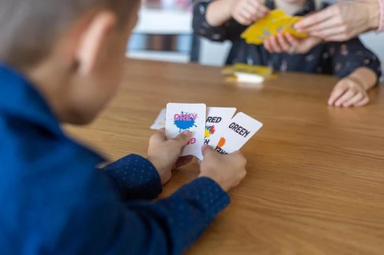 Een kleurrijk en meeslepend spel, perfect voor spelletjesavonden met het hele gezin, middagpauzes met collega’s of op school en feestjes! Dit is een blauwe kaart. En deze? Rood of groen? Raak al je kaarten zo snel mogelijk kwijt door de juiste kleur of het juiste woord of allebei of omgekeerd uit te spelen. Op sommige kaarten staat een kleur geschreven maar met inkt in een andere keur. Dus bv. het woord rood in groen geschreven. Bevat 110 kleurrijke kaarten. Het spel is heel verslavend!