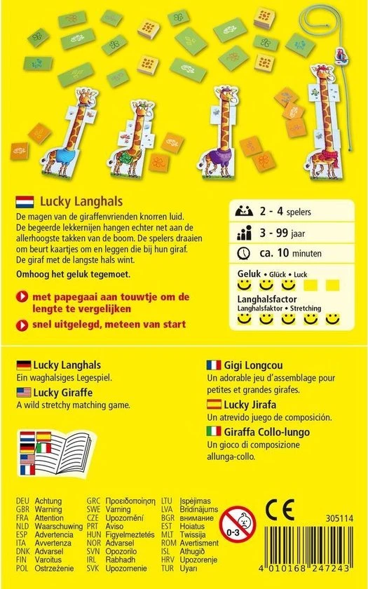 - Inhoud: 4 giraffenkoppen, 4 giraffenlichamen, 24 halskaartjes, 1 papegaai, 1 touwtje, 24 symboolkaartjes,1 handleiding.