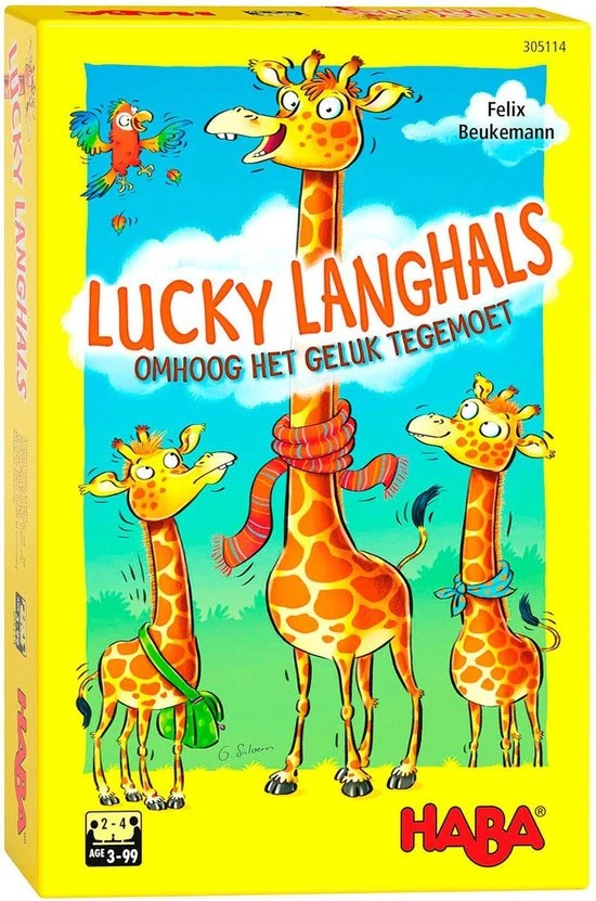 Met spel Lucky langhals ga je omhoog, het gelukt tegemoet! Een plezierig legspel, snel uitgelegd om meteen van start te gaan. De magen van de giraffenvrienden knorren luid. De begeerde lekkernijen hangen echter net aan de allerhoogste takken van de boom. De spelers draaien om beurt kaartjes om en leggen die bij hun giraf. Met de papegaai aan het touwtje vergelijk je de lengte. De giraf met de langste hals wint.