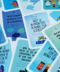 De 80 uitnodigende vragenkaartjes helpen hen op een ontspannen en speelse manier contact te hebben over de scheiding. Dankzij deze vragenkaartjes kunnen kinderen gemakkelijker vertellen wat er in hen omgaat en krijgen zij de mogelijkheid om hun gevoelens en gedachten te delen. Het helpt kinderen als zij zich kunnen uiten; het effect hiervan is direct zichtbaar. Kinderen kunnen de scheiding gemakkelijker verwerken en leren omgaan met alle veranderingen. Wanneer de kaartjes actief gebruikt worden zullen zij zich gezien, gehoord en gesteund voelen. Kinderen zullen meer ontspanning en zelfvertrouwen ervaren als hun verhaal er helemaal mag zijn. Dat is zo belangrijk en waardevol, juist in een moeilijke periode.