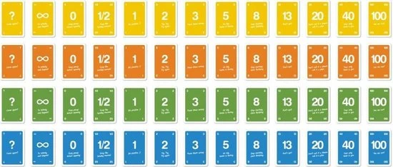 Elk doosje bevat 55 speelkaarten te onderscheiden in 4 reeksen met ieder een eigen kleur. Hierdoor kunnen er per spel maximaal 4 teamleden meedoen. De waarden die op de kaarten staan zijn:0, ½, 1, 2, 3, 5, 8, 13, 20, 40 & 100. Ook zit er standaard een uitleg kaart bij de set, een koffiekaart en een kaart met een vraagteken. Wilt u meer weten over de spelregels van Scrum Planning Poker? Op www.scrumproducten.nl leggen we u in 6 stappen uit hoe Scrum Planning Poker werkt.