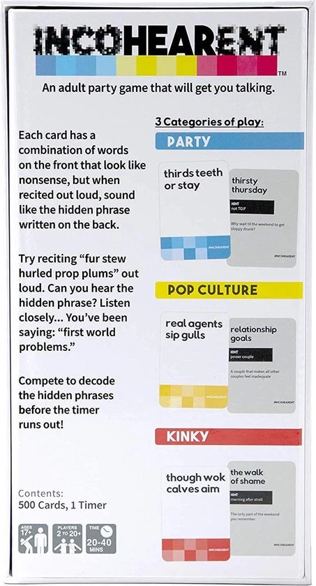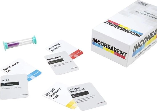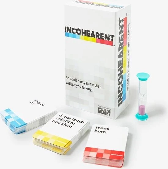 Dit is Incohearent: an English Adult Party game, een kaartspel voor volwassenen. Incohearent is het gezelschapsspel voor volwassenen van What Do You Meme™ dat je aan het praten krijgt! Laat het lachen beginnen terwijl je strijdt om zin te krijgen uit gebrabbel uit een van de drie categorieën: kinky, feest- en popcultuur.Spelletjes zoals deze zijn perfect om als cadeau te geven!