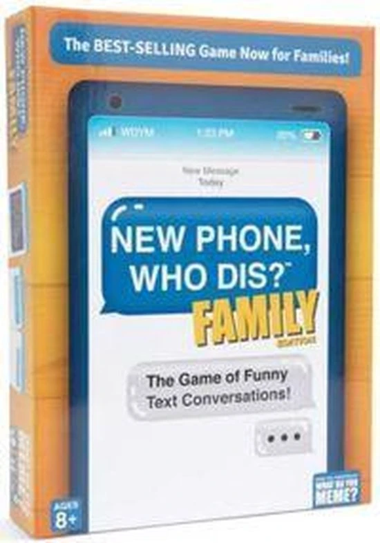 What Do You Meme? New Phone Who Dis?: Family EditionInhoud:240 familie-vriendelijke Inbox cards300 familie-vriendelijke Reply cardsInstructieboekDe spelletjesavonden (en groeps-sms chats) van je familie zullen nooit meer hetzelfde zijn met New Phone, Who Dis? Family Edition, ons 100% offline, 100% gezinsvriendelijke, maffe sms-combospelletje! Ga de strijd aan om belachelijke Inbox en Reply kaarten aan elkaar te koppelen – de grappigste combo wint. Spelers trekken om beurten een verzonden (of inbox) kaart terwijl de rest van de groep strijdt om de grappigste antwoord kaart te spelen. Zodra iedereen zijn antwoordkaart heeft gespeeld, kent de roulerend jurylid een punt toe aan de grappigste antwoordkaart. Perfect voor feestjes, familieavonden, vakanties, re??nies, en nog veel meer.Kenmerken:Aantal spelers: 3+Speeltijd: 30-90 minutenUitgever: What Do You Meme?